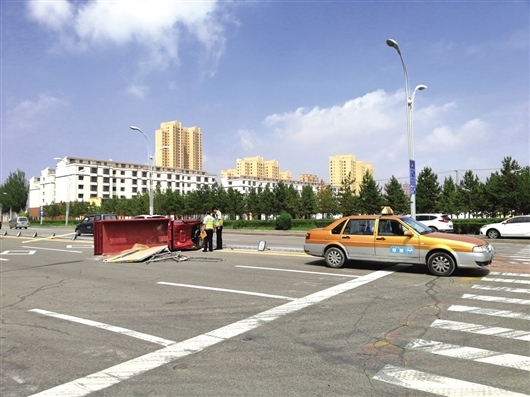 出租車駕駛員弓先生告訴記者:“當(dāng)時我駕車從北向南行駛,車上有一名乘客坐在副駕駛位置,正在此處停車等待掉頭時,后面的三輪車撞了上來,當(dāng)時撞擊的力度很大,把我的車撞出了線,三輪車側(cè)翻也撞倒了護欄?!惫壬f事故發(fā)生后乘客自行離開。三輪摩托車駕駛員姜先生身上多處擦傷,他說當(dāng)時車上只有他一人,也是北向南行駛。姜先生說:“車上拉載的都是裝修用具和材料,事故發(fā)生時有些蒙?!?/p>