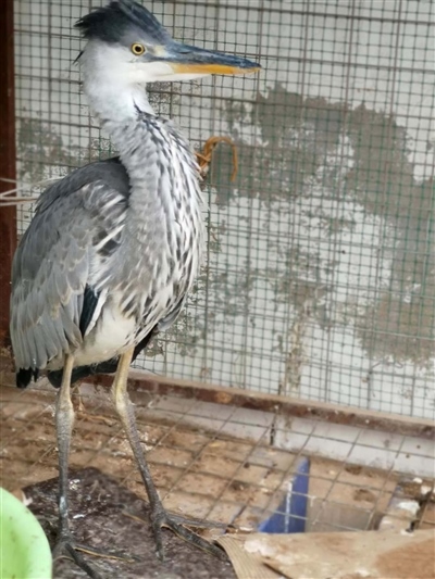 經(jīng)有經(jīng)驗(yàn)的民警辨認(rèn),這是一只蒼鷺幼鳥(niǎo)。這只鳥(niǎo)身高約70公分,長(zhǎng)長(zhǎng)的尖嘴,身著灰色體羽,頭戴深灰色羽冠,兩條大長(zhǎng)腿格外顯眼,白色的前頸縱向排列著黑灰色條紋。民警聯(lián)系獸醫(yī)為其做了體檢,經(jīng)檢查,這只鳥(niǎo)并無(wú)傷病,可能是由于剛出窩飛行能力不強(qiáng)、捕食能力不足,造成體力虛弱。民警買(mǎi)來(lái)小魚(yú),只見(jiàn)這只鳥(niǎo)狼吞虎咽享用起來(lái),不久便精神十足,開(kāi)始啄民警??吹剿w力開(kāi)始恢復(fù),民警懸著的心也就放下了。民警計(jì)劃選擇合適時(shí)間和地方將其放飛。