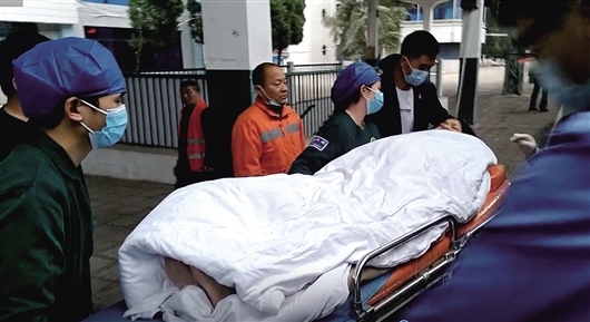 在江西信豐站臨時(shí)停靠?jī)煞昼?,大家協(xié)力將產(chǎn)婦和新生兒抬到120急救車上,送往醫(yī)院進(jìn)一步治療。(圖片由劉晶新提供)