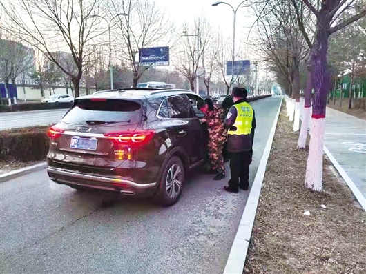 12月20日17時15分,九原區(qū)交管大隊第三警務區(qū)執(zhí)勤民警正駕駛警車在轄區(qū)巡邏清理違停車輛,當巡邏至緯四路與經(jīng)二路交叉口時,他們發(fā)現(xiàn)一輛黑色越野車停在緯四路非機動車道內(nèi)且打著雙閃?!翱吹杰嚧蛑p閃燈,想著可能是車上的人有啥困難,我們就把警車開到附近,看到一名年輕男子正在車周圍焦急地來回徘徊,神情特別緊張?!眻?zhí)勤民警說。