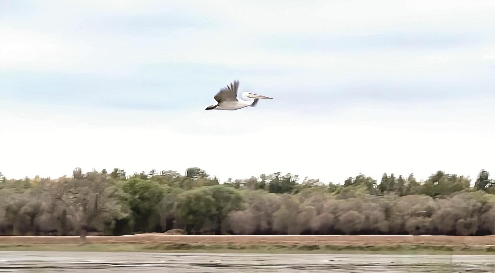 飛翔中的卷羽鵜鶘。(圖由包頭市濕地保護(hù)中心提供)