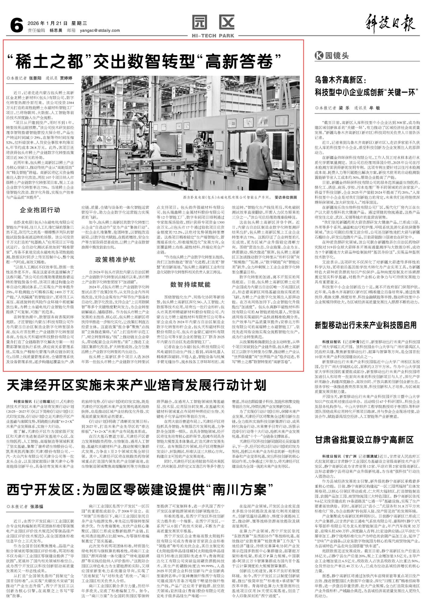 2026年1月21日《科技日?qǐng)?bào)》第6版刊發(fā)了《“稀土之都”交出數(shù)智轉(zhuǎn)型“高新答卷”》的文章,報(bào)道了從政策精準(zhǔn)滴灌到企業(yè)主動(dòng)轉(zhuǎn)型,從單個(gè)項(xiàng)目突破到全產(chǎn)業(yè)鏈升級(jí),包頭稀土高新區(qū)正以數(shù)字化轉(zhuǎn)型為引擎,推動(dòng)稀土產(chǎn)業(yè)從“世界級(jí)儲(chǔ)量”向“世界級(jí)產(chǎn)業(yè)”穩(wěn)步邁進(jìn),書(shū)寫(xiě)“稀土之都”數(shù)智轉(zhuǎn)型的“高新答卷”。