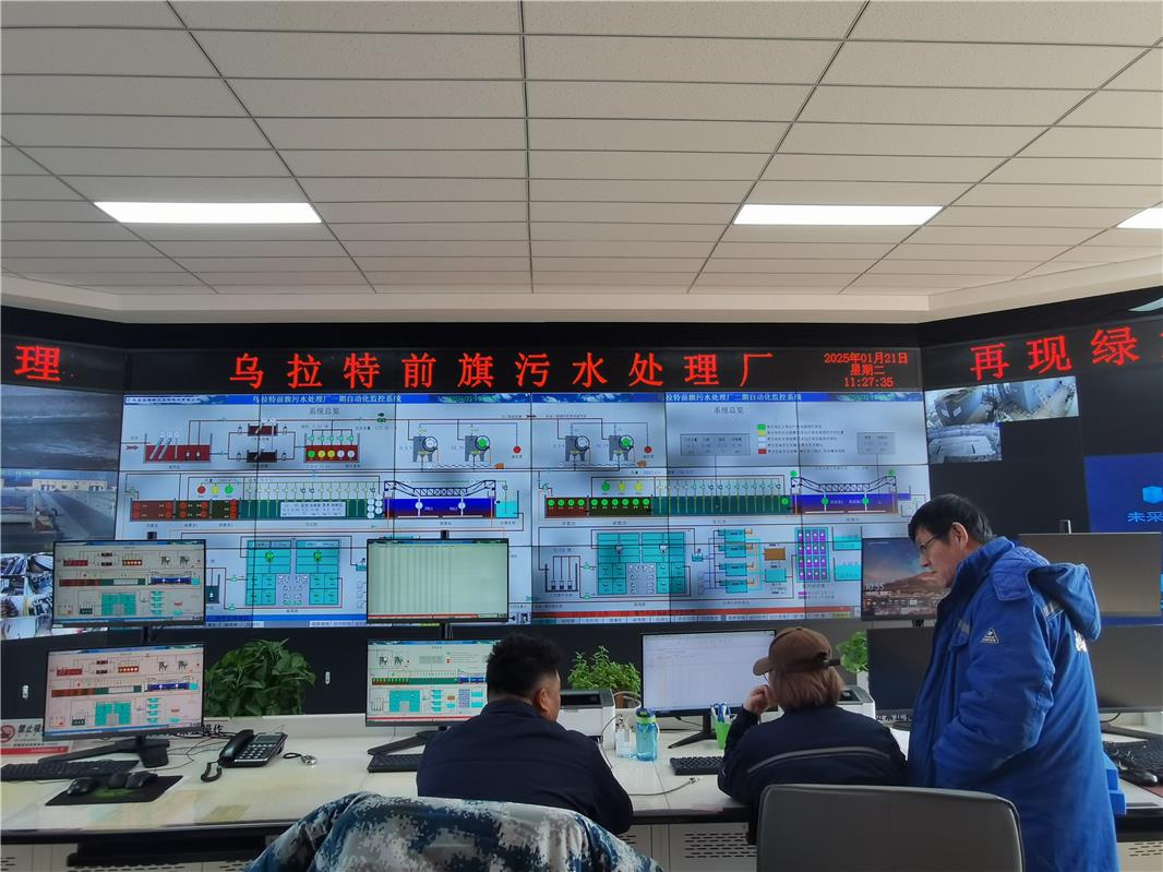 烏拉特前旗污水處理廠總控室。該廠通過智能化在線監(jiān)測,確保污水處理全過程嚴(yán)格達(dá)標(biāo)。2024年,共處理污水558萬噸,日均處理量達(dá)到1.53萬噸,達(dá)標(biāo)率為98.9%。處理后的中水達(dá)到國家一級A標(biāo)準(zhǔn),主要用于電廠、水務(wù)企業(yè)、道路灑掃和濕地生態(tài)補水等,實現(xiàn)了水資源的再利用。在水資源循環(huán)利用方面作出了積極貢獻(xiàn)。