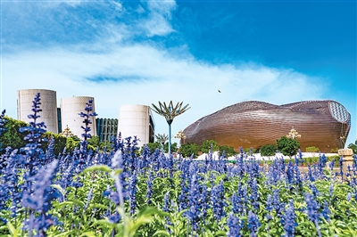 從外觀上來看,斜置的墻壁、反重力的扭曲線條、玻璃的通透與金屬的冷峻相結合等現(xiàn)代建筑手段,在七大建筑得到了恰如其分的展現(xiàn)。其內部空間結構同樣值得稱贊。在博物館,記者走遍各個展區(qū),從樓梯、窗戶、展區(qū)來看,其空間結構與功能布局是美觀和實用的完美融合。在圖書館,記者發(fā)現(xiàn),遠山框進窗戶,綠色環(huán)繞四周。在這里,功能性的光芒與美學性的溫度和諧共生。