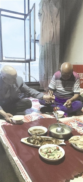 臨走前,老人(右)在“兒子”家吃晚飯。