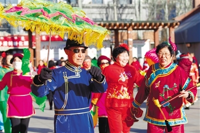 2月8日,在呼和浩特市金地廣場,由社區(qū)居民組成的秧歌隊(duì)正在演出。當(dāng)日,呼和浩特市人民路街道辦事處舉辦新春文藝匯演活動(dòng),共有18支志愿隊(duì)伍、260余人參加,極大豐富了社區(qū)居民文化生活。(記者  懷特烏勒斯  攝)