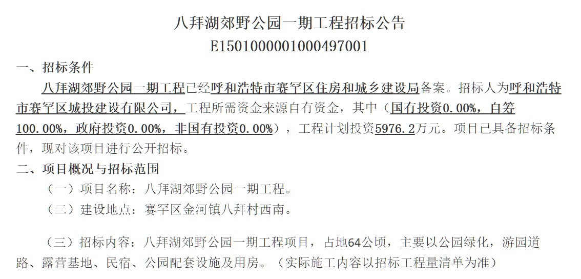 7月5日,記者從呼和浩特市公共資源交易監(jiān)督管理局了解到,八拜湖郊野公園一期工程已經(jīng)呼和浩特市賽罕區(qū)住房和城鄉(xiāng)建設局備案,項目已具備招標條件,啟動公開招標。