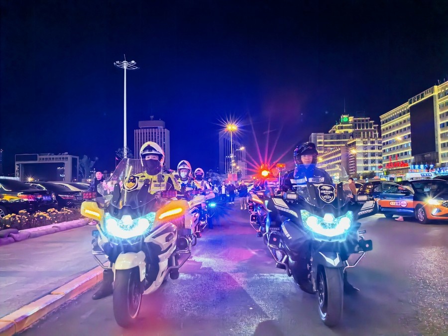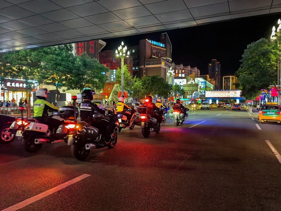 中秋、國慶兩節(jié)期間,呼和浩特市公安局反恐怖和特巡警支隊(duì)?wèi)?zhàn)鷹突擊隊(duì)與交警支隊(duì)停放管理大隊(duì)鐵騎中隊(duì),聯(lián)合開展巡邏防控工作,并組成了一支騎警處突機(jī)動(dòng)隊(duì),成了呼和浩特大街小巷一道亮麗的風(fēng)景線。圖為中秋節(jié)之夜,這支機(jī)動(dòng)隊(duì)開展聯(lián)合巡邏,守護(hù)青城百姓平安過節(jié)。 王鑫 攝影報(bào)道
