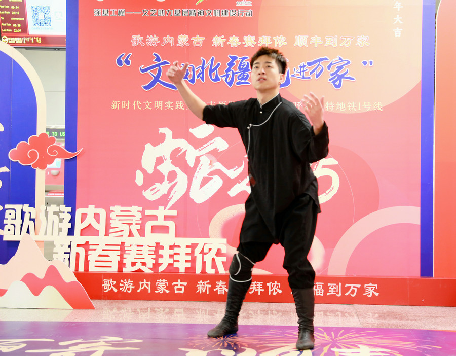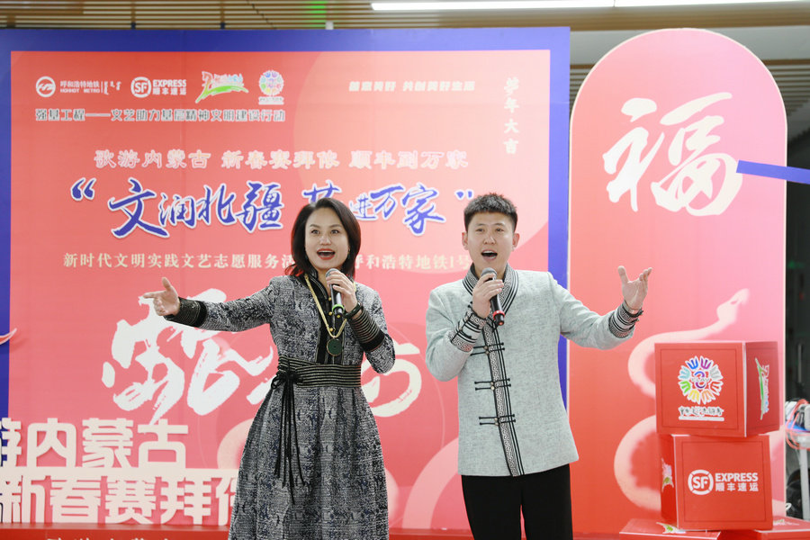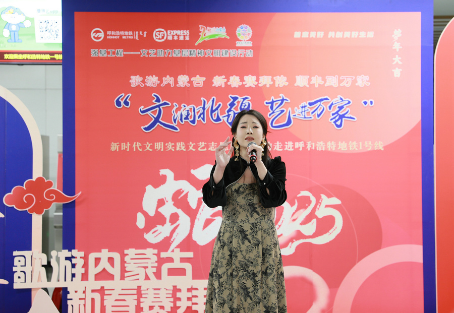 北疆新聞呼和浩特1月1日電(記者 張楊)“夢(mèng)中的呼和浩特,胸懷像草原遼闊……”2025年1月1日上午,悠揚(yáng)的歌聲在呼和浩特地鐵 1 號(hào)線內(nèi)蒙古博物院站飄揚(yáng)。新年第一天,“歌游內(nèi)蒙古 新春賽拜儂 順豐到萬家”新時(shí)代文明實(shí)踐文藝志愿服務(wù)活動(dòng)在此舉行,現(xiàn)場(chǎng)除了青城市民耳熟能詳?shù)脑瓌?chuàng)歌曲《夢(mèng)中的呼和浩特》外,根據(jù)南北朝民歌改編的《敕勒歌》、布里亞特蒙古族民歌《吆赫爾》、二人臺(tái)傳統(tǒng)唱段《拜大年》、相聲表演《說學(xué)逗唱》、手風(fēng)琴獨(dú)奏《我的少女時(shí)代》、蒙古舞《迷途的羔羊》等精彩紛呈的節(jié)目,讓往來的乘客們紛紛駐足、高聲喝彩。