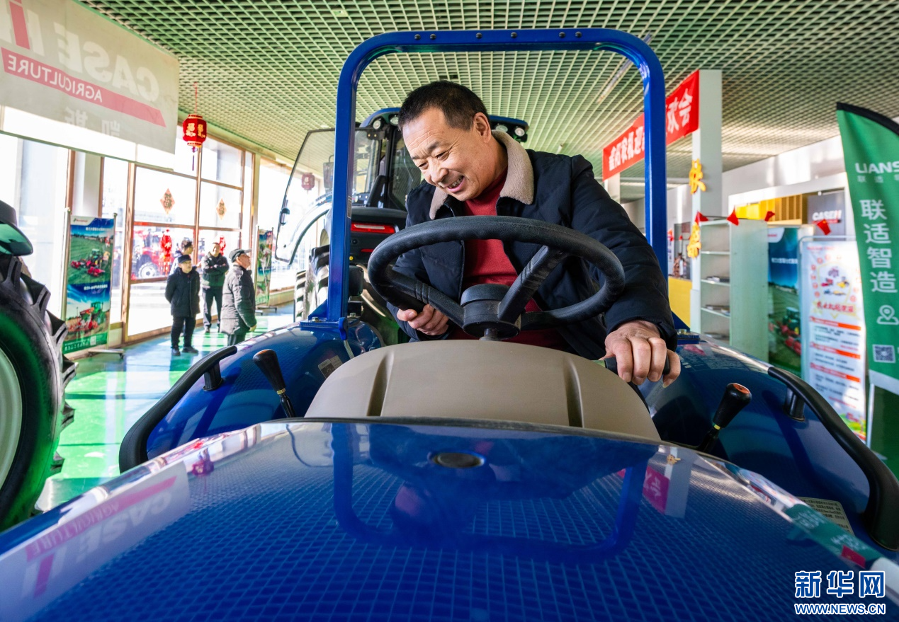 ??2月18日,在位于呼和浩特市玉泉區(qū)的一家農(nóng)機(jī)設(shè)備公司展銷(xiāo)大廳,農(nóng)戶(hù)在試駕拖拉機(jī)。新華網(wǎng)發(fā)(丁根厚 攝)