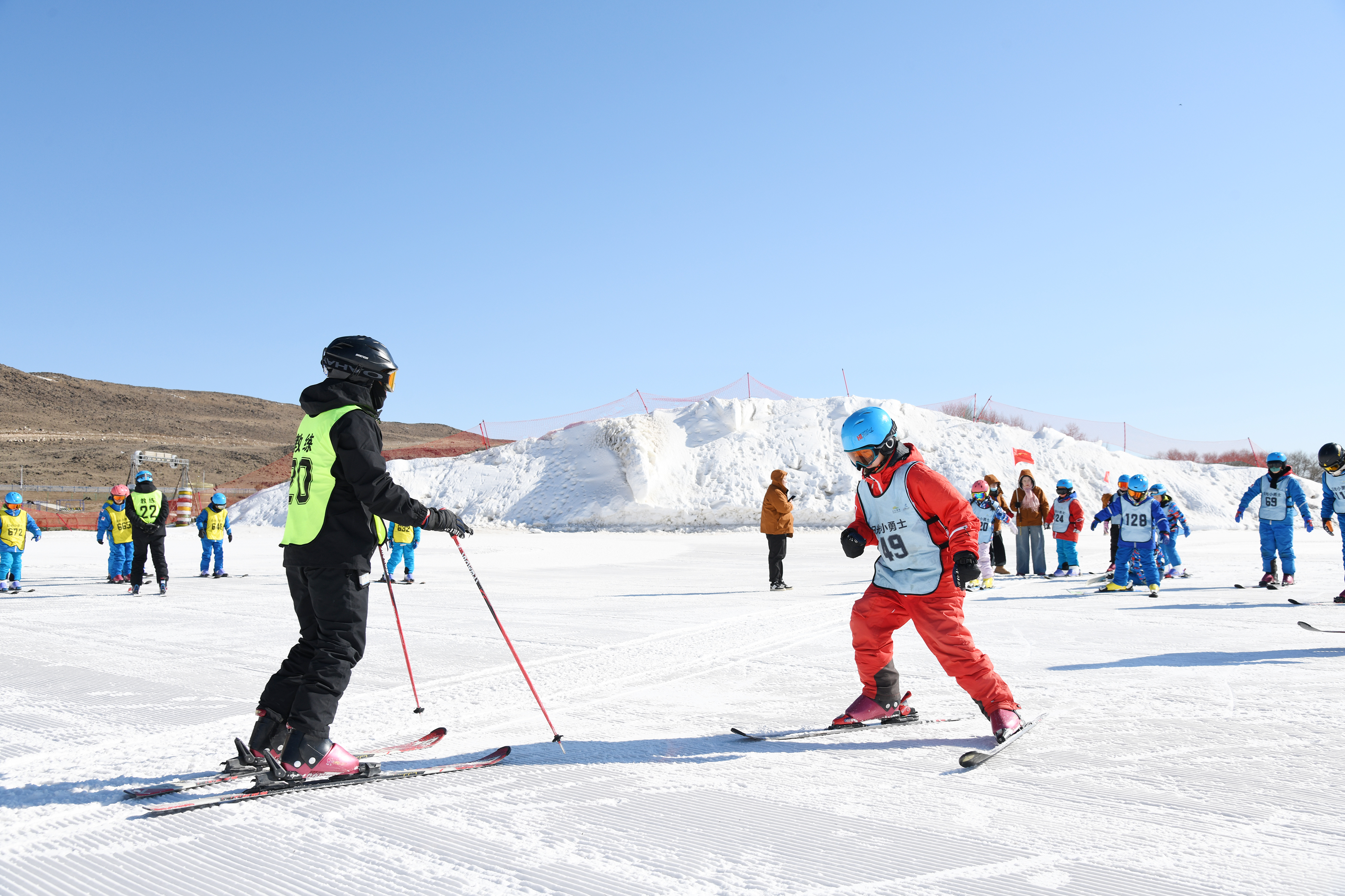 “把腳尖對(duì)準(zhǔn)雪板凹槽,腳后跟用力下踩?!薄半p腿呈‘V’字形,與肩同寬,掌握好平衡?!倍顮I(yíng)學(xué)員在烏蘭察布日光火山大河灣滑雪度假區(qū)專業(yè)教練的悉心指導(dǎo)下,從最基礎(chǔ)的穿戴裝備學(xué)起,逐漸掌握了犁式轉(zhuǎn)彎、半犁式轉(zhuǎn)彎等技巧。經(jīng)過一個(gè)多小時(shí)的學(xué)習(xí)和鍛煉,有一定基礎(chǔ)的學(xué)員已經(jīng)可以在雪道上腳踏雪板飛馳而下,并流暢地完成大回轉(zhuǎn)等動(dòng)作;有的學(xué)員偶爾摔倒,也會(huì)迅速起身繼續(xù)訓(xùn)練。