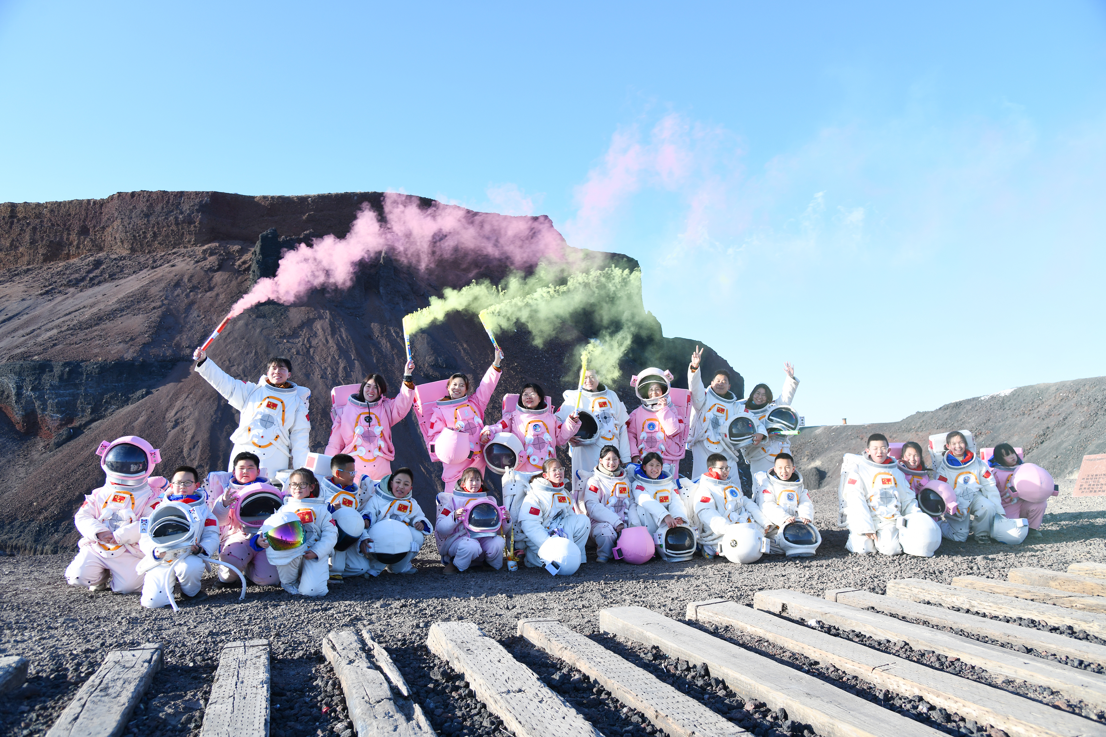 師生們身著宇航服在火山下留影?! ?/span>
