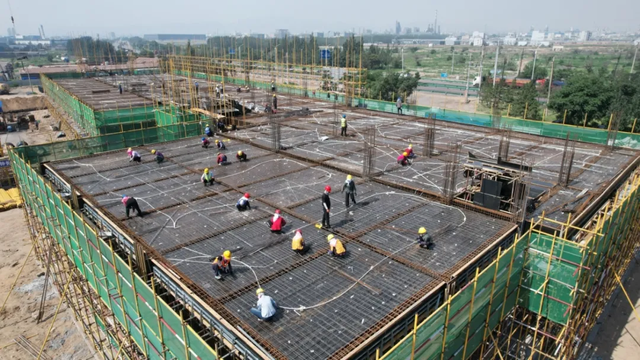 “目前,項目正在進行基礎(chǔ)設(shè)施施工,辦公樓已完成1層封頂,1號車間正在進行主體結(jié)構(gòu)的鋼管架的搭設(shè)和模板制作,外網(wǎng)工程和2號、3號車間基礎(chǔ)施工也在順利推進?!表椖渴┕挝回撠?zé)人王秀山告訴記者,該項目計劃今年8月底完成辦公樓、綜合服務(wù)樓主體施工,9月中旬完成3個車間主體施工。