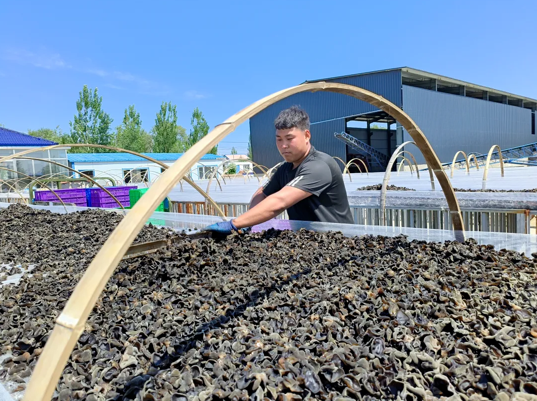 在瑞秋農(nóng)牧專業(yè)合作社的大院里晾曬剛收獲的黑木耳
