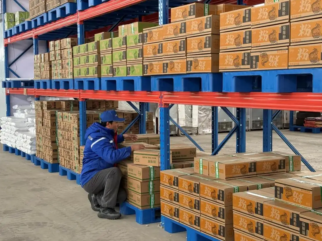 這座占地3000平方米的現(xiàn)代化物流樞紐功能齊全:保鮮冷藏區(qū)保障牛羊肉和乳制品的新鮮口感;常溫倉儲區(qū)整齊碼放著大米、沙果干等特產(chǎn);打包區(qū)里工人配合膜包機完成高效分裝。更重要的是,政府持續(xù)給予租金補貼,大大減輕了企業(yè)的倉儲負擔。