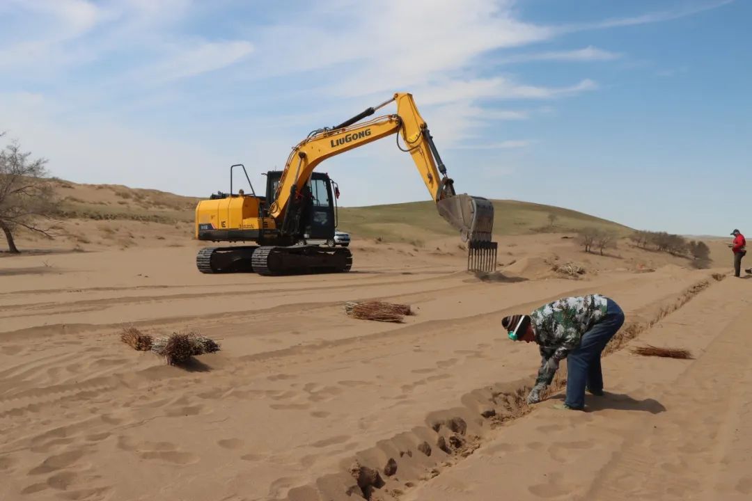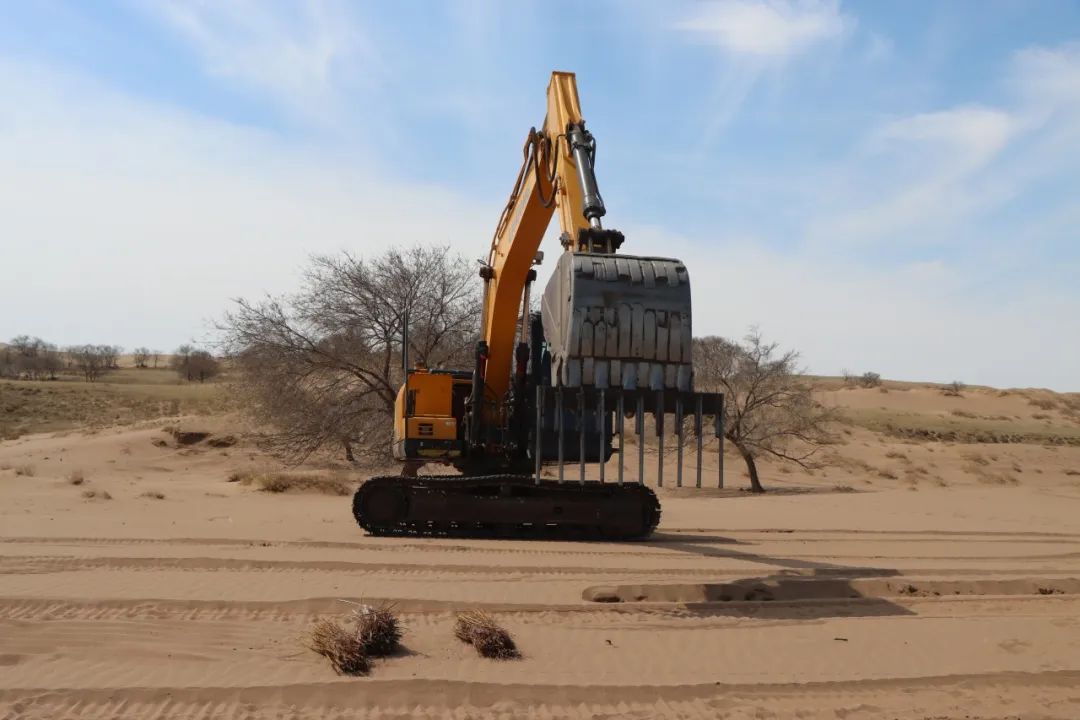 據(jù)錫林浩特市二蛋牧民養(yǎng)殖專業(yè)合作社負(fù)責(zé)人介紹,在傳統(tǒng)的沙漠治理作業(yè)中,工人需要手動(dòng)栽植黃柳等固沙植物。然而,人工種植不僅效率低,勞動(dòng)強(qiáng)度也大。為突破這一困境,合作社成員經(jīng)過多次試驗(yàn),最終決定對挖掘機(jī)進(jìn)行創(chuàng)新改造,加裝叉具,這一巧妙的設(shè)計(jì)不僅實(shí)現(xiàn)了對黃柳種植深度和間距的精準(zhǔn)把控,還能有效避免土壤翻動(dòng),最大程度地保持了土壤水分,切實(shí)保護(hù)了沙地的生態(tài)環(huán)境?! ?/p>