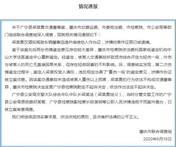 據肇慶市官方發(fā)布公眾號“肇慶發(fā)布”消息,關于廣寧縣梁某勇交通肇事案,肇慶市紀委監(jiān)委、市委政法委、市檢察院、市公安局等部門組成聯(lián)合調查組深入調查,通報相關情況:梁某勇飲酒后駕駛車輛肇事逃逸并指使他人作偽證,涉嫌妨害作證罪已被逮捕。