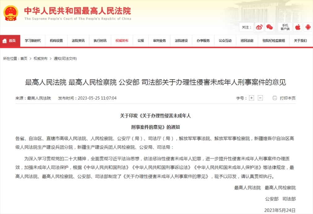 最高人民法院、最高人民檢察院25日聯(lián)合發(fā)布關(guān)于辦理強(qiáng)奸、猥褻未成年人刑事案件適用法律若干問題的解釋。最高人民法院、最高人民檢察院、公安部、司法部聯(lián)合發(fā)布關(guān)于辦理性侵害未成年人刑事案件的意見。
