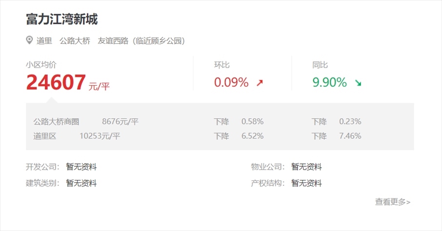 公開信息顯示,富力江灣新城地處哈爾濱道里區(qū)沿江核心地段,項(xiàng)目一期于2014年10月29日完成交房。房天下數(shù)據(jù)顯示,富力江灣新城目前二手房均價(jià)為2.46萬元/平方米。