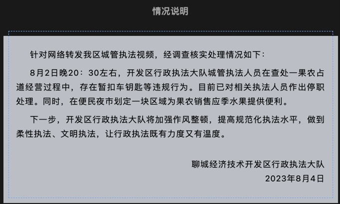 ·山東聊城通報“城管拔走小販車鑰匙”:相關(guān)執(zhí)法人員停職。