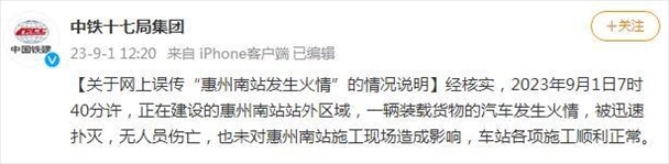 ·中鐵十七局集團(tuán)發(fā)布對“惠州南站發(fā)生火情”的說明:一輛裝載貨物的汽車發(fā)生火情,被迅速撲滅,未造成人員、財(cái)產(chǎn)傷亡。