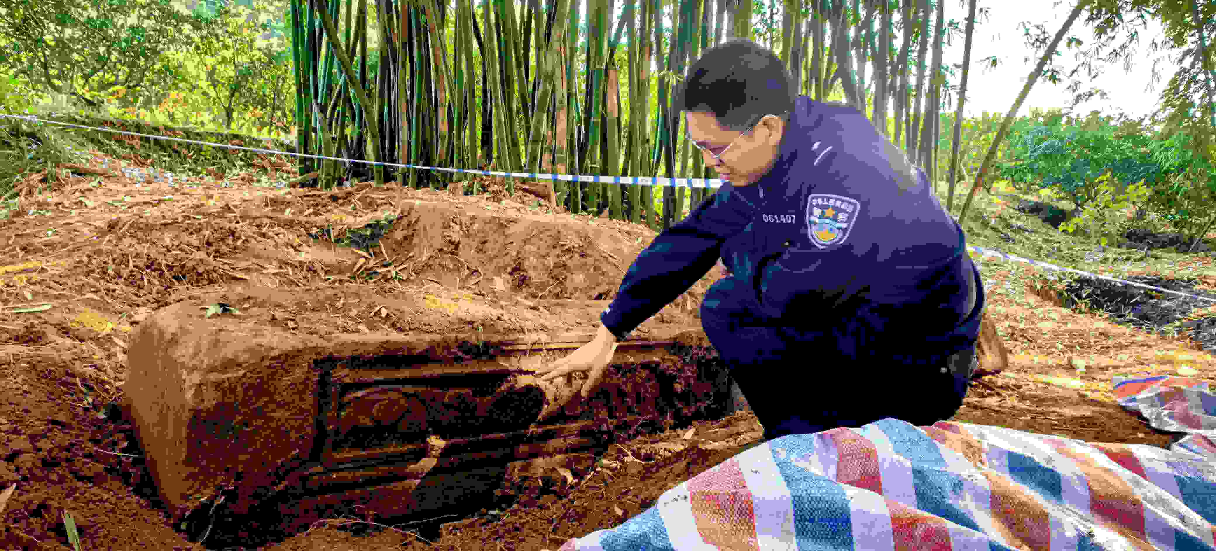 韓某家族的這座祖墳地處一片竹林中,離最近的房屋直線距離不足20米。為此,他趕到現(xiàn)場發(fā)現(xiàn),墓室上的土有多處被挖痕跡,但墓門上的石頭還沒被打開?!斑@個地方是條大路,白天也沒人看到有人來過?!表n某懷疑有人盯上了他家的祖墳,想要盜墓,并判斷那些人還會再來。