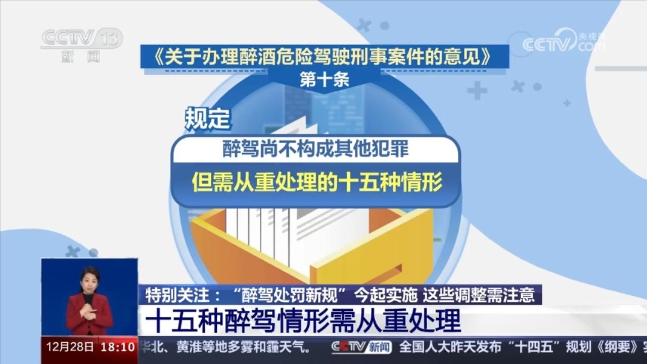 央視網(wǎng)消息:12月28日開(kāi)始,《關(guān)于辦理醉酒危險(xiǎn)駕駛刑事案件的意見(jiàn)》,俗稱(chēng)“醉駕處罰新規(guī)”正式實(shí)施。此前,《意見(jiàn)》由最高人民法院、最高人民檢察院、公安部、司法部聯(lián)合發(fā)布。