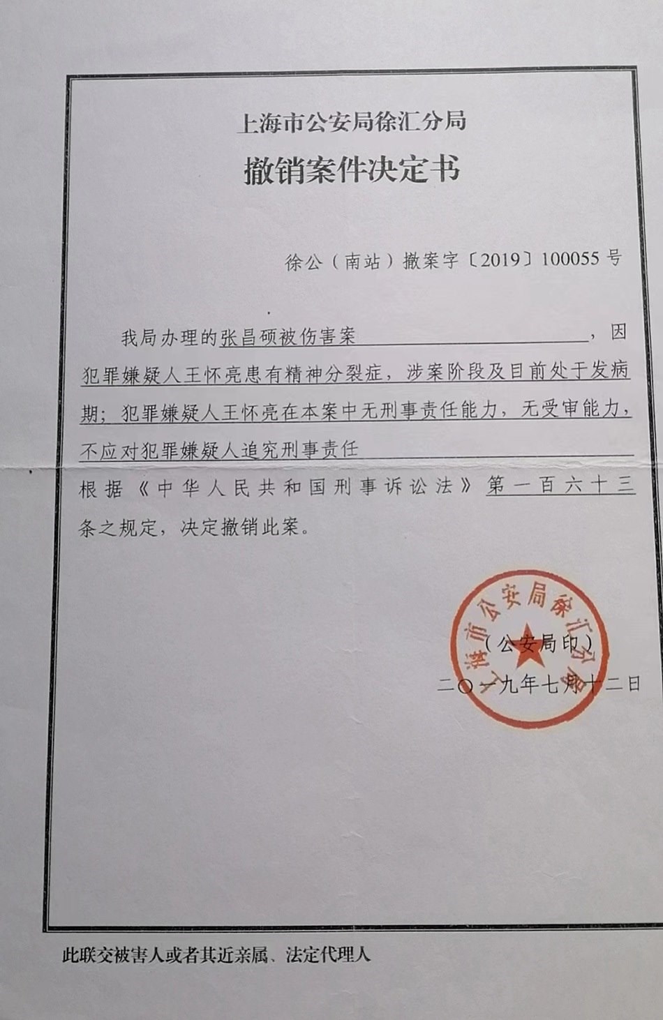 張宏銀回憶,他已經(jīng)不記得這起依法不負(fù)刑事責(zé)任的精神病人強(qiáng)制醫(yī)療程序案件開庭審理的具體時(shí)間,只記得是2019年下半年的一天上午,那天犯罪嫌疑人沒(méi)有到場(chǎng),律師也沒(méi)有到場(chǎng),檢察院的兩位人員出席了開庭。徐匯區(qū)法院當(dāng)庭做出判決:王懷亮被送往醫(yī)療機(jī)構(gòu)進(jìn)行強(qiáng)制醫(yī)療。2019年7月12日,張宏銀收到公安局的撤銷案件決定書。