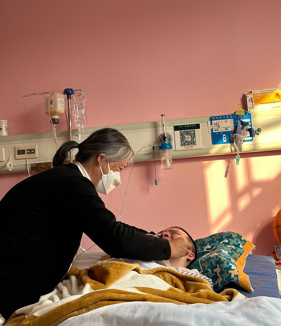 一月上旬的一個(gè)下午,鄭建英像過(guò)去一千多個(gè)日子一樣,坐在兒子床尾的椅子上,盯著他床頭監(jiān)視器的氧保。這幾年,她已經(jīng)形成條件反射,當(dāng)數(shù)值低于92時(shí),她會(huì)從椅子上彈起來(lái)幫他吸痰。