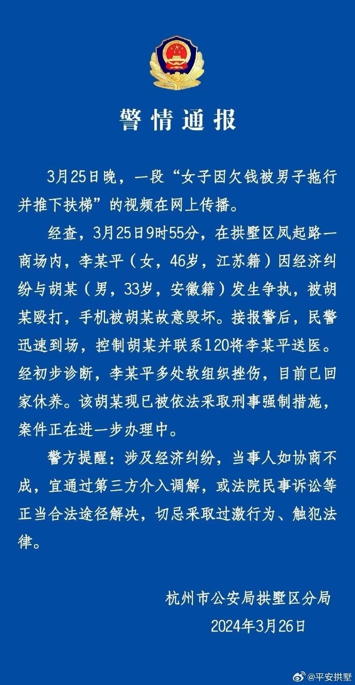 女子欠錢(qián)被男子拖下扶梯?杭州警方:涉經(jīng)濟(jì)糾紛 切忌采取過(guò)激行為