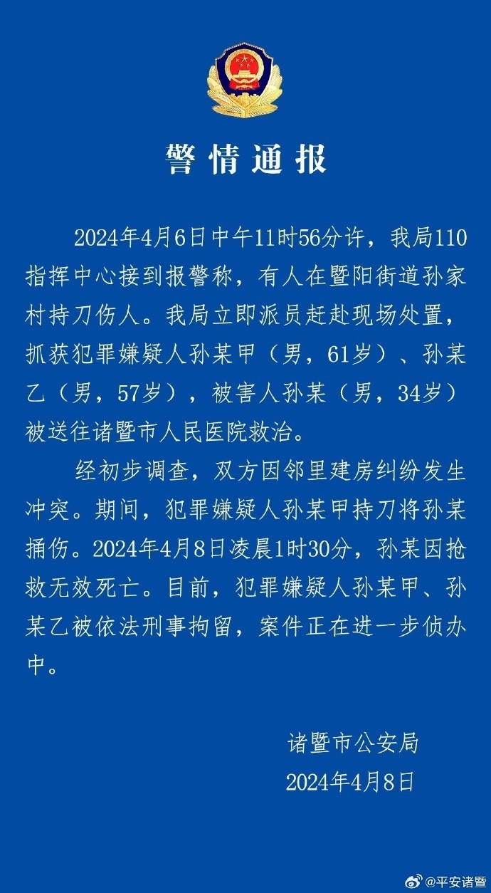 央視網(wǎng)消息:4月8日,浙江諸暨市公安局通報(bào):4月6日中午11時(shí)56分許,我局110指揮中心接到報(bào)警稱(chēng),有人在暨陽(yáng)街道孫家村持刀傷人。我局立即派員趕赴現(xiàn)場(chǎng)處置,抓獲犯罪嫌疑人孫某甲(男,61歲)、孫某乙(男,57歲),被害人孫某(男,34歲)被送往諸暨市人民醫(yī)院救治。經(jīng)初步調(diào)查,雙方因鄰里建房糾紛發(fā)生沖突。期間,犯罪嫌疑人孫某甲持刀將孫某捅傷。2024年4月8日凌晨1時(shí)30分,孫某因搶救無(wú)效死亡。目前,犯罪嫌疑人孫某甲、孫某乙被依法刑事拘留,案件正在進(jìn)一步偵辦中。