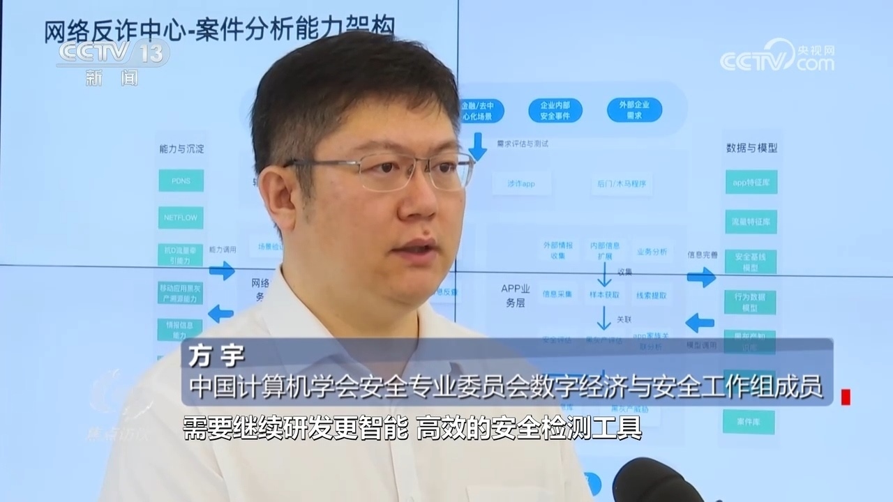 方宇:“下一步,針對(duì)涉詐APP的發(fā)現(xiàn),需要繼續(xù)研發(fā)更智能、高效的安全檢測工具,建立涉詐APP的黑名單數(shù)據(jù)庫。另外,結(jié)合一些新型、智能化的技術(shù)手段,通過對(duì)網(wǎng)絡(luò)流量分析,及時(shí)發(fā)現(xiàn)詐騙流量,并通過公安、網(wǎng)信、金融、市場監(jiān)管等部門進(jìn)一步加強(qiáng)聯(lián)動(dòng)、信息及時(shí)共享、及時(shí)進(jìn)行阻斷,多措并舉,共同努力,形成合力,打擊涉詐APP。”