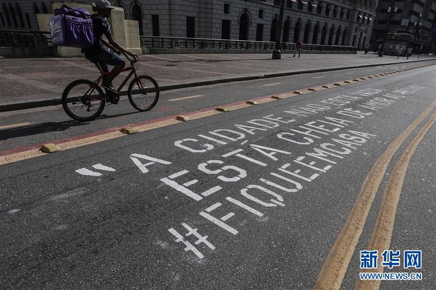 這是4月21日,巴西圣保羅市的一條道路上寫(xiě)有“城市不是空的,而是充滿著鄰里間的關(guān)愛(ài)#待在家中”字樣。新華社發(fā)(拉赫爾·帕特拉索攝)