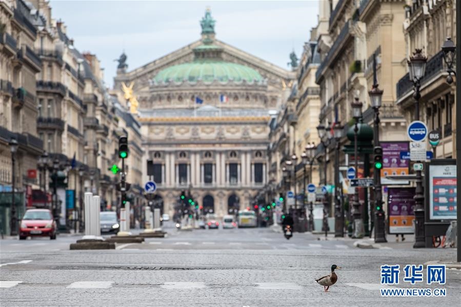 這是4月6日,在法國(guó)巴黎,一只鴨子在巴黎歌劇院前的大道上“溜達(dá)”?!敖懔睢睂?shí)施期間,不少動(dòng)物“溜達(dá)”到巴黎空蕩無(wú)人的大街上。新華社發(fā)(奧雷利安·莫里薩爾攝)