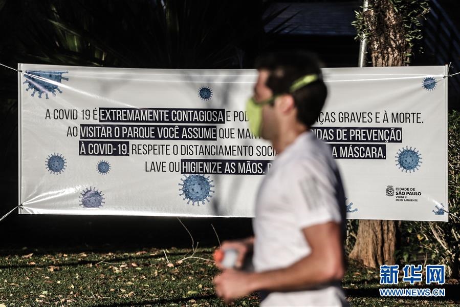 這是7月13日,在巴西圣保羅市重新開(kāi)放的伊比拉普埃拉公園內(nèi),一名男子經(jīng)過(guò)提醒游客做好防護(hù)的條幅。新華社發(fā)(拉赫爾·帕特拉索攝)