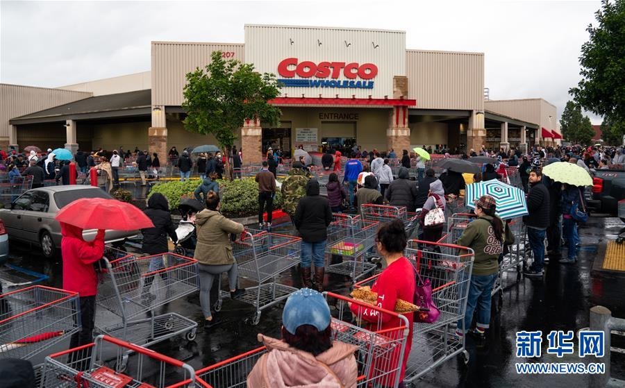 這是3月14日,在美國(guó)洛杉磯一家超市外,民眾冒雨排隊(duì)等候開(kāi)門(mén)購(gòu)物。新華社發(fā)(錢(qián)衛(wèi)忠攝)