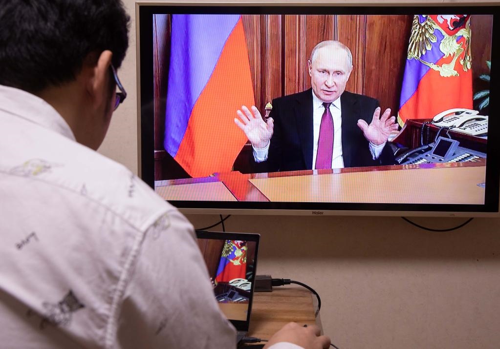 俄羅斯總統(tǒng)普京24日清晨發(fā)表電視講話說,決定在頓巴斯地區(qū)發(fā)起特別軍事行動(dòng)。(新華社記者白雪騏攝)