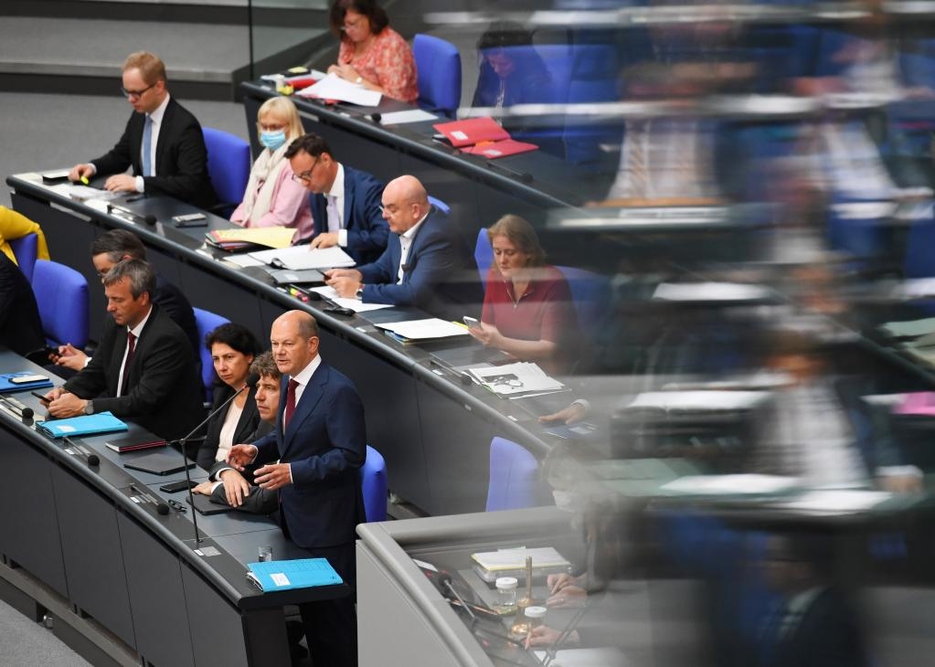 7月6日,德國(guó)總理朔爾茨(前右一)在位于柏林的德國(guó)聯(lián)邦議會(huì)接受例行問(wèn)詢(xún)。新華社記者任鵬飛攝