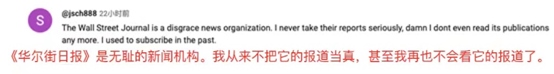 網(wǎng)友@jsch888說(shuō):“《華爾街日?qǐng)?bào)》是無(wú)恥的新聞機(jī)構(gòu)。我從來(lái)不把它的報(bào)道當(dāng)真,我甚至再也不會(huì)看它的報(bào)道了。”