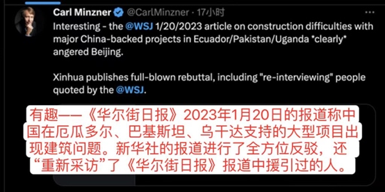 美國(guó)福特漢姆大學(xué)教授、美國(guó)外交關(guān)系協(xié)會(huì)中國(guó)問(wèn)題高級(jí)研究員明克勝轉(zhuǎn)發(fā)了新華社的報(bào)道,并稱(chēng):有趣——《華爾街日?qǐng)?bào)》2023年1月20日的報(bào)道稱(chēng)中國(guó)在厄瓜多爾、巴基斯坦、烏干達(dá)支持的大型項(xiàng)目出現(xiàn)建筑問(wèn)題。新華社的報(bào)道進(jìn)行了全方位反駁,還“重新采訪(fǎng)”了《華爾街日?qǐng)?bào)》報(bào)道中援引過(guò)的人。