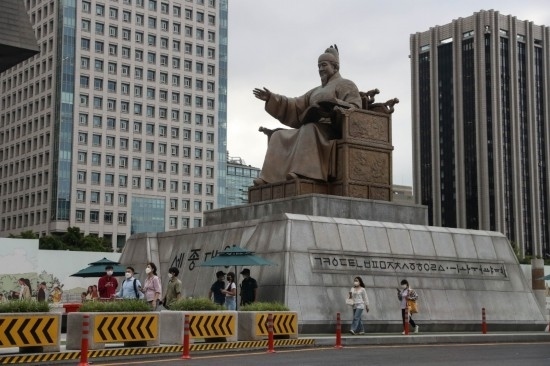 2021年7月8日,行人佩戴口罩走在韓國首爾光化門廣場上。(新華社記者王婧嬙攝)