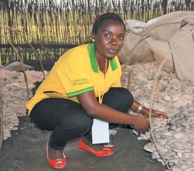 盧旺達(dá)國立大學(xué)的學(xué)生姍臺在菇棚中采收平菇。 中國國家菌草工程技術(shù)研究中心供圖