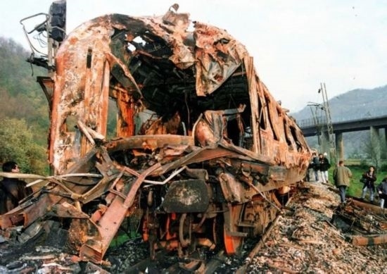 1999年3月24日,以美國為首的北約向南斯拉夫聯(lián)盟開始發(fā)動大規(guī)??找u,武力干涉科索沃危機。資料照片顯示被北約飛機炸毀的火車。新華社發(fā)