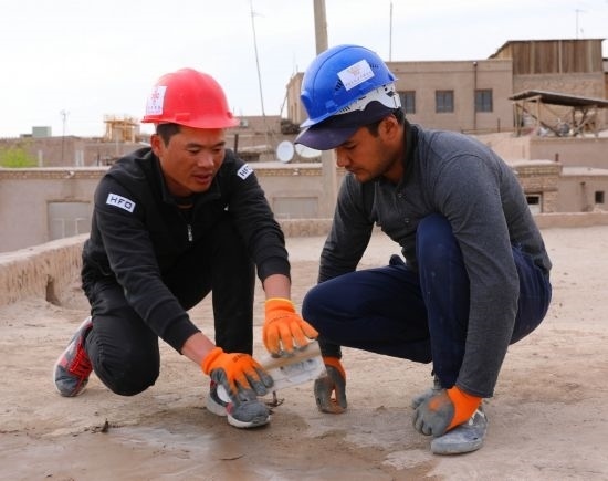 在烏茲別克斯坦希瓦古城哈?!つ吕聨焓矂e吉清真寺,中方文物修復人員指導烏方工作人員修復清真寺屋頂。
