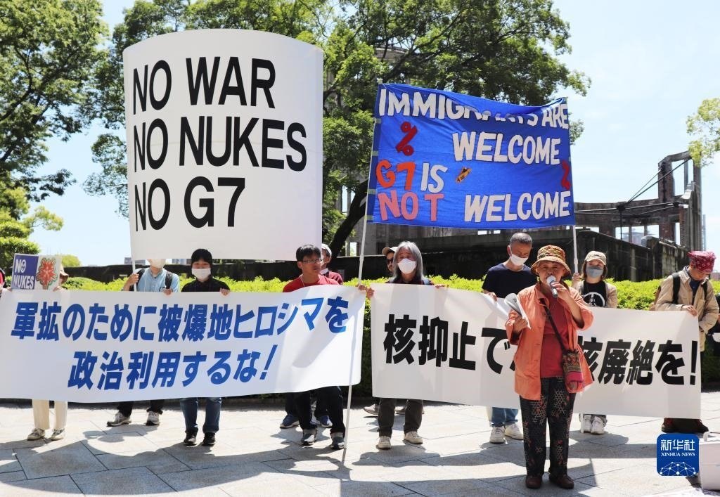 5月14日,在日本廣島和平紀(jì)念公園原子彈轟炸遺址前,日本民眾舉著“不要戰(zhàn)爭、不要核武器、不要G7”等標(biāo)語,強烈抗議七國集團(G7)峰會將在廣島召開。新華社記者 楊光 攝