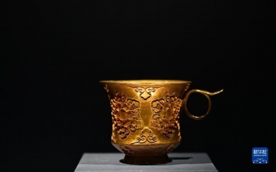 這是在陜西歷史博物館拍攝的掐絲團花紋金杯(5月11日攝)。唐代帶把杯除部分器物直接來自中亞粟特,還有部分屬于唐人仿制粟特風格的作品,這些物品都是東西方文明通過絲綢之路進行交流互鑒的的珍貴物證。