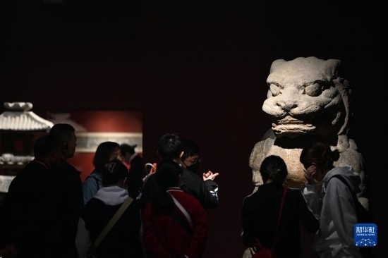 5月8日,游客在西安博物院參觀史君墓石槨。墓主史君是北周涼州薩保,粟特人。石槨整體為中國傳統(tǒng)歇山頂?shù)钐檬浇ㄖ?,四壁浮雕?nèi)容和風格則帶有鮮明的西域特色。