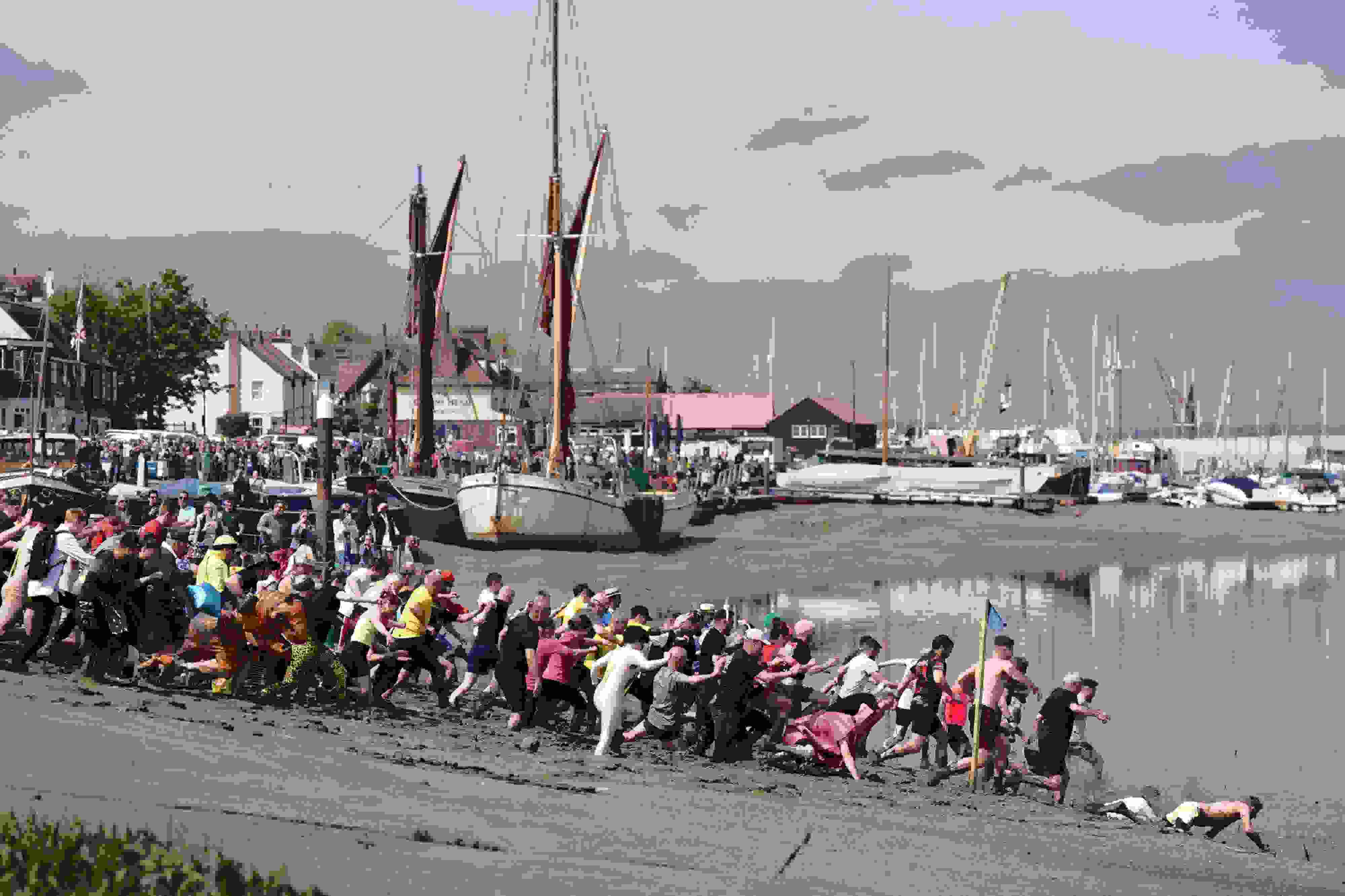 當(dāng)?shù)貢r(shí)間2023年5月14日,英國莫爾登,參賽者參加一年一度的滾泥巴大賽。該大賽是一項(xiàng)慈善活動,參賽者要在埃塞克斯郡的黑水河河床上賽跑。 視覺中國