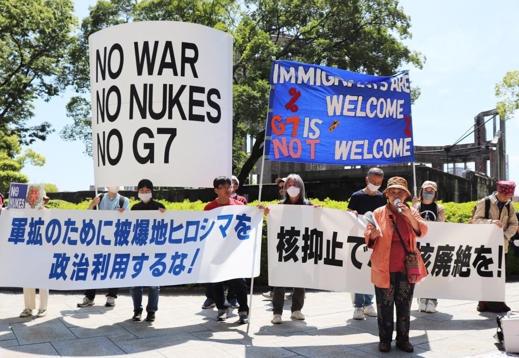 5月14日,在日本廣島街頭,日本民眾舉著“不要戰(zhàn)爭、不要核武器、不要G7”等標(biāo)語,強(qiáng)烈抗議七國集團(tuán)(G7)峰會將在廣島召開。新華社記者楊光攝