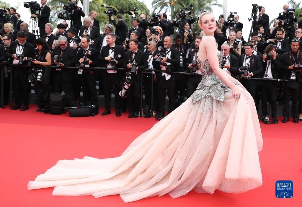 5月16日,在法國(guó)戛納舉行的第76屆戛納國(guó)際電影節(jié)上,演員埃勒·范寧亮相紅毯。   新華社記者 高靜 攝